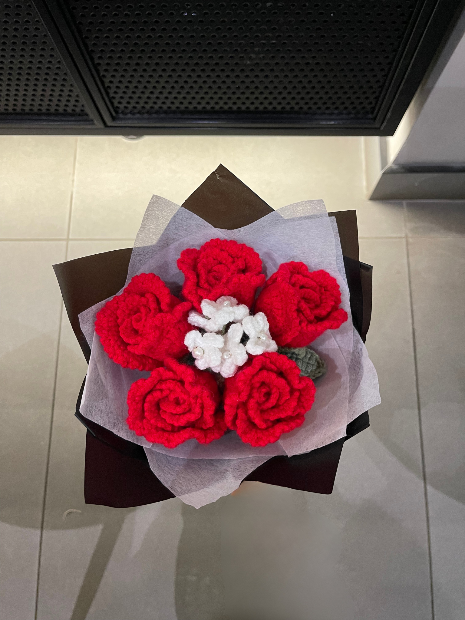 Noir Romance is an elegant arrangement featuring 5 large, handcrafted roses paired with delicate white forget-me-nots, beautifully wrapped in luxurious black paper.